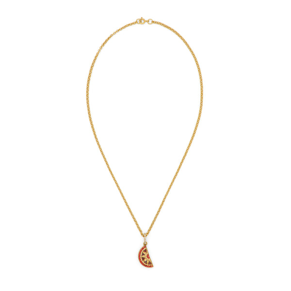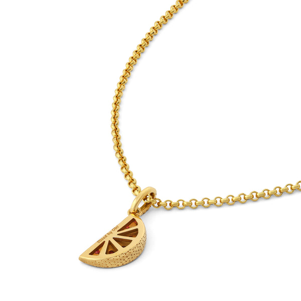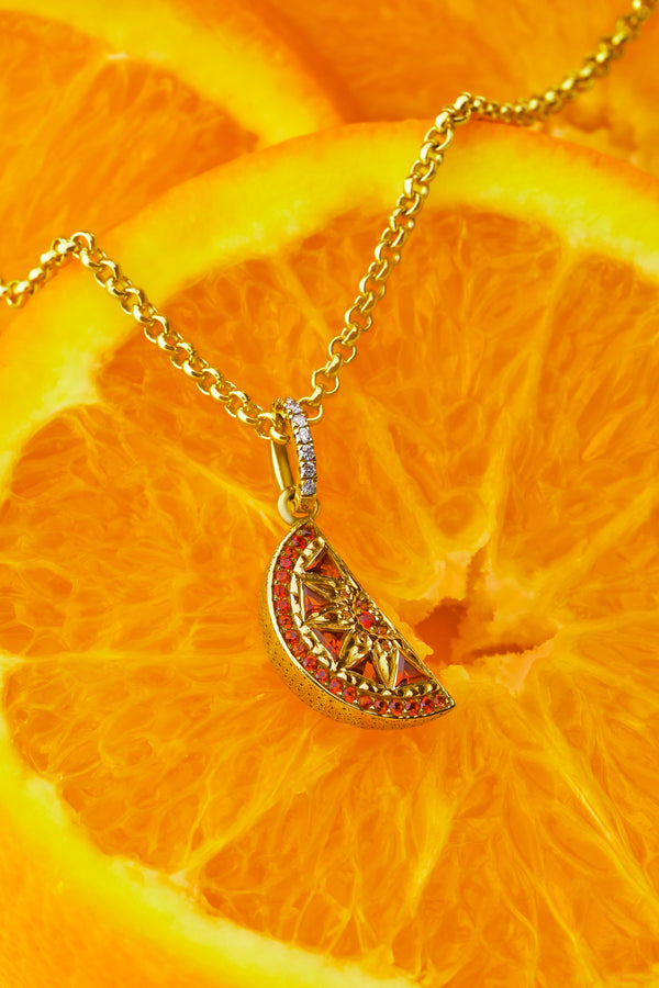 Crafted in recycled 18ct gold and hand-set with brilliant cut diamonds, orange sapphires and garnets, this pendant is full of festive flavour.